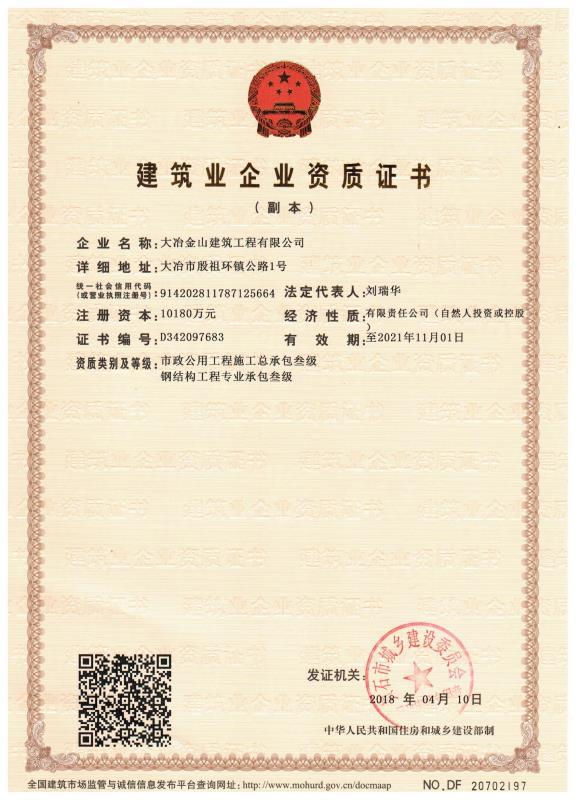 大冶金山建筑工程有限公司始建于1984年,屬鎮辦集體企業。1997年改制為大冶山建筑工程有限責任公司,屬股份制企業。2013年更名為大冶金山建筑工程有限公司,2018年3月公司資源重組,公司注冊資金達到10180.00萬元,公司法定代表人為劉瑞華。公司具有古建筑工程專業承包壹級、建筑工程施工總承包貳級、市政工程總承包叁級、鋼結構工程專業承包叁級資質。